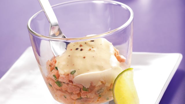 Mélanger le saumon cru haché au couteau avec la ciboulette ou les échalotes, le jus d'un citron, le sel et poivre, la moutarde, les câpres, le persil haché et le filet d'huile d'olive puis dresser dans des verres. - 2Monter le sabayonMélanger au fouet dans une petite casserole les jaunes d'oeufs, l'eau, le jus de citron, les épices puis le lait en Poudre Régilait qui facilitera la tenue du sabayon en fin de cuisson.