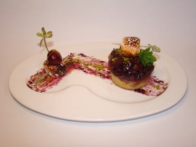Dressage :A l'aide d'un pinceau, faites deux traits avec le jus réduit des cerises dans l'assiette. Saupoudrez avec un peu de poudre de pistaches vertes. Posez sur le côté gauche une brochette surmontée d'une cerise, et de l'autre côté, le clafoutis. Décorez avec une seconde brochette, de la poudre de pistaches et une sommité de menthe.