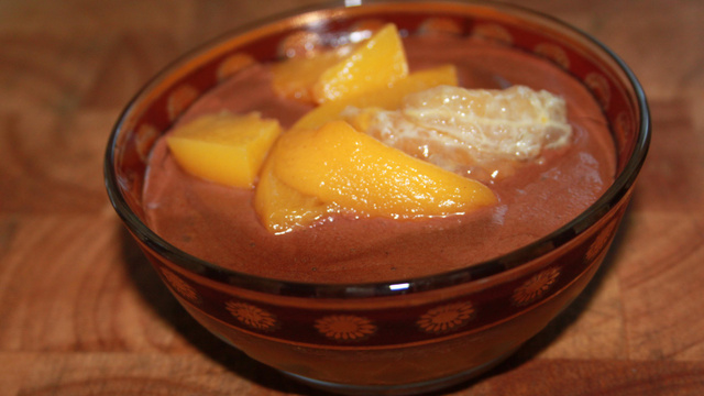 Servez vos mousses décorées de quartiers de pêche pelée.