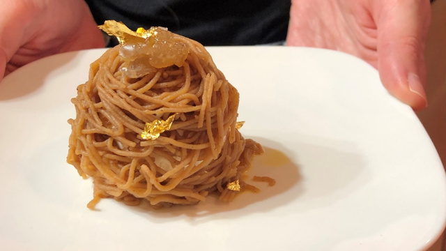 Décorer avec un marron glacé et une feuille d’or.