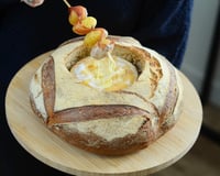Pendant que les pommes de terre cuisent, entourez la boîte en bois du Mont d'Or de papier alu. Creusez un trou d'environ 2 cm de diamètre et ajoutez-y l'ail haché et le vin blanc.
