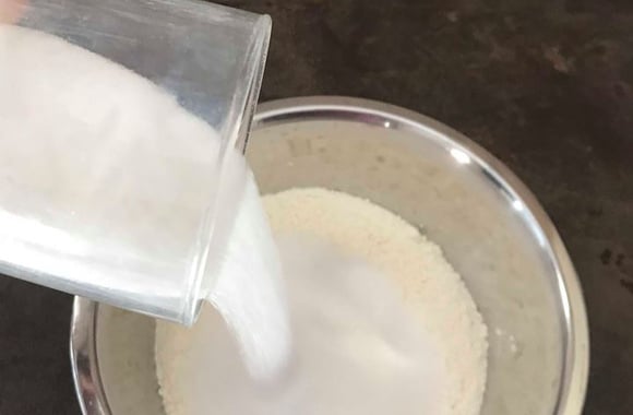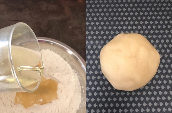1Versez la farine, le sucre dans un saladier et bien mélangez. Faites un trou au centre et ajoutez l'huile. Mélangez d'abord avec une cuillère en bois puis une fois que la pâte devient consistante mettez-y les doigts former une boule. Elle doit ressembler à une pâte sablée.