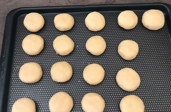 2Prendre une plaque y mettre du papier sulfurisé. Séparez votre pâte en petites boules, posez celles-ci sur votre plaque et écrasez-les légèrement avec le plat de votre main.