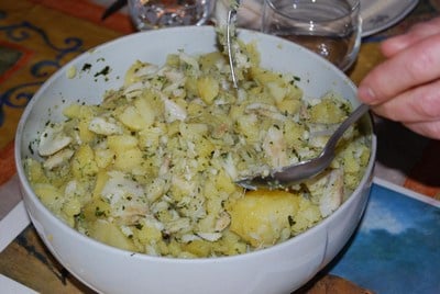 Quand les pommes de terre sont cuites les éplucher, les couper en tranches dans le même plat que la morue , écraser l'ail, hacher le cerfeuil, poivrer et bien mélanger le tout en l'enrobant copieusement d'huile d'olive.