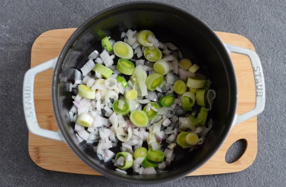 3Chauffez l'huile dans une cocotte et faites revenir l'oignon et les poireaux pendant 5 minutes.