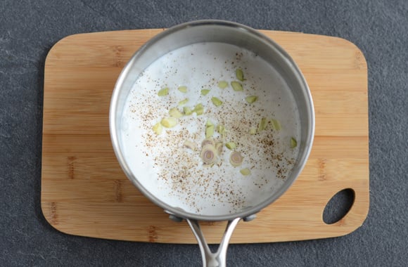 5Dans une grande casserole, faites chauffer le lait de coco avec du sel, du poivre et les rondelles de citronnelle.