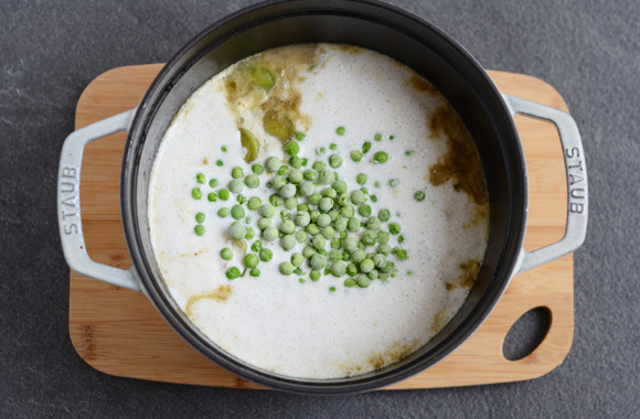 7Versez le lait de coco dans la cocotte avec le curry de chou-fleur, ajoutez les petits pois et faites cuire 5 minutes.