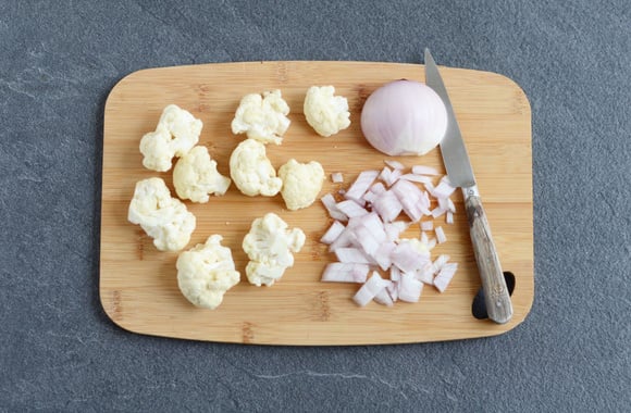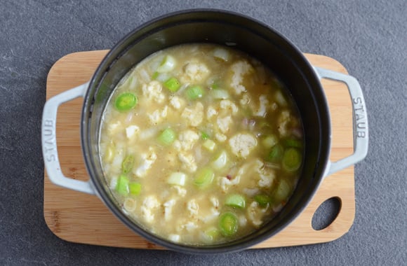 Ajoutez les petits bouquets de chou-fleur et le bouillon. Laissez mijoter 10 minutes.