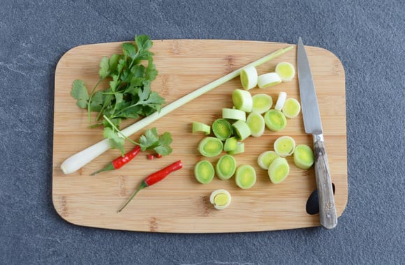 Coupez la citronnelle et le piment rouge en rondelles et hachez la coriandre.