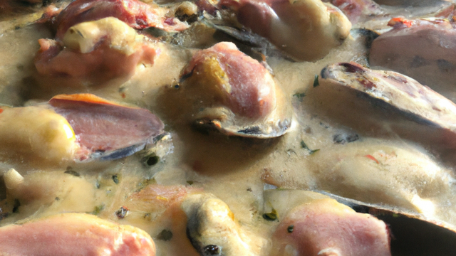 Faite revenir l'oignon coupé en lamelles dans un peu de beurre, versez l'oignon sur les moules ainsi que les allumettes de jambon, la crème fraîche et le cidre. - 2