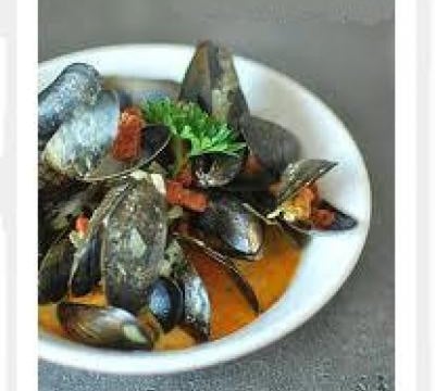 Moules avec une sauce au curcuma fait avec le jus des moules.