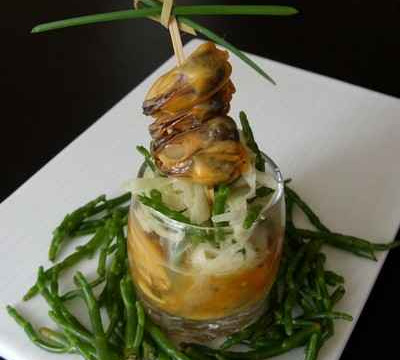 La salicorne est une plante marine qui apporte à cette mise en bouche du croquant et le fenouil de la fraîcheur....le associé au moules et safran....un délice !