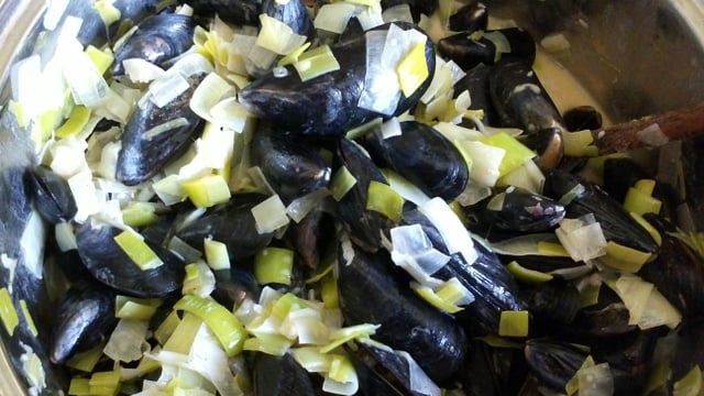 Ajouter le verre de Marsala, bien mélanger et verser les moules. Bien remuer pour les enrober de poireaux et de jus, couvrir et les laisser s'ouvrir en secouant de temps en temps la marmite pour que toutes soient ouvertes.