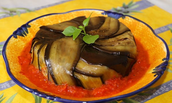 Dans un moule à charlotte où à manqué, disposez les tranches d'aubergine en formant une rosace en les superposant légèrement en tournant dans le sens des aiguilles d'une montre. Placez la point au centre du moule et laissez légèrement dépasser les tranches. Disposez la moitié de la farce au fond du moule, recouvrez de la béchamel puis des tranches d'aubergines. Terminez avec le restant de farce. Rabattez les aubergines qui tapissent le moule vers l'intérieur, puis fermez avec les tranches d'aubergines. Tassez pour obtenir quelque chose de plat.