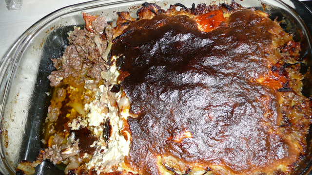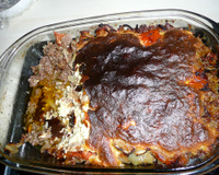Huiler un plat et disposer les aubergines. Recouvrir du contenu de la casseroe puis d'aubergines.