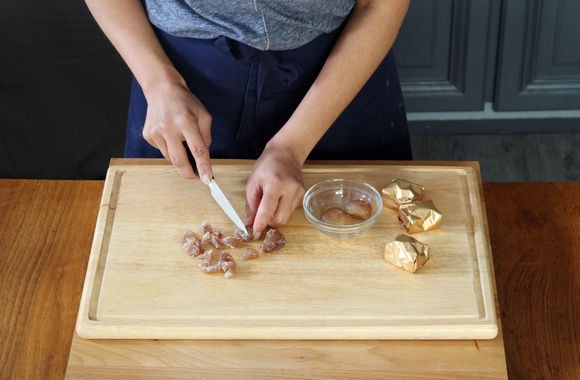2Coupez les marrons glacés en morceaux.