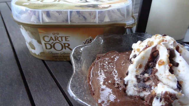Au moment de servir, préparez 6 ramequins et répartissez dans chacun une rosace Crème glacée Carte d'Or® Façon Glacier Saveur Dame Blanche, puis entourez chaque rosace de mousse au chocolat, en lissant bien le dessus. Servez immédiatement.