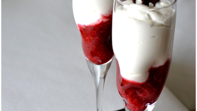 Ecrasez les framboises pour les réduire en purée, puis répartissez-les dans le fond des 6 coupes ou des verrines. Sortez la ganache du frigo et montez la en chantilly à l'aide du batteur (si elle a du mal à monter rajoutez un peu de crème liquide). A l'aide d'une poche à douille ou d'une cuillère, disposez la mousse au chocolat sur la purée de framboises. - 4