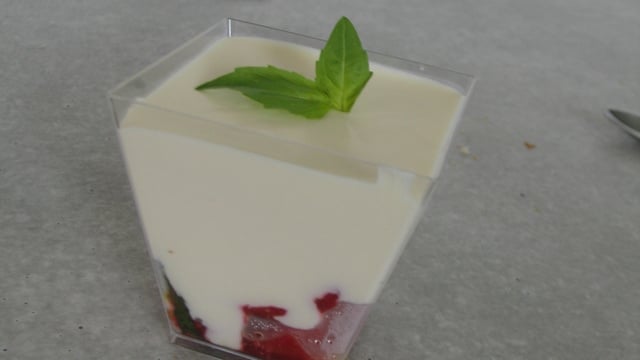 Déposer la mousse au chocolat blanc sur une poêlée de fraises au basilic.