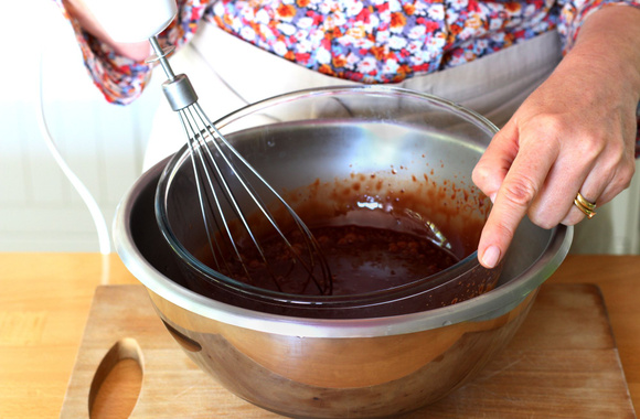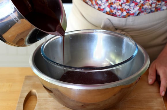 Quand le chocolat est fondu et que le mélange est homogène, versez dans le bol posé sur son bain glacé.