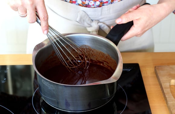 A partir du moment où le fouet liasse des traces, le mélange va très rapidement se transformer en mousse. Soyez vigilent, afin que le mélange ne se transforme pas en beurre de cacao car il deviendrait granuleux.