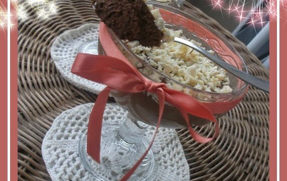 Découper votre chocolat blanc à l'aide d'un économe (pour faire des copeaux), puis parsemez vos mousse de copeaux de chocolat blanc.