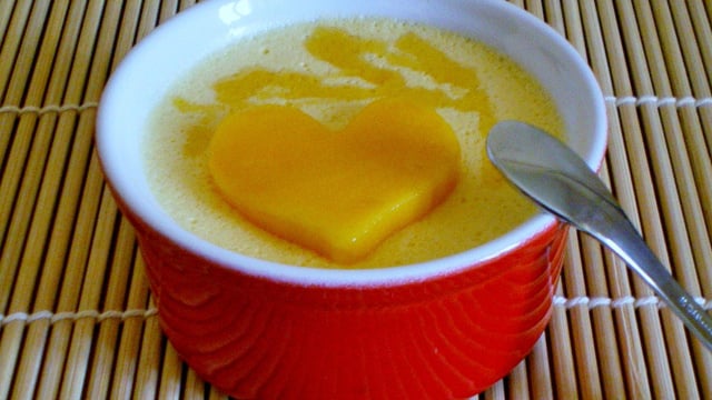 Pour la présentation: découper une tranche de mangue assez fine. A l'aide d'un emporte-pièce découper la forme dans la mangue et la déposer sur la mousse avec un filet de caramel (en bouteille ou maison !).