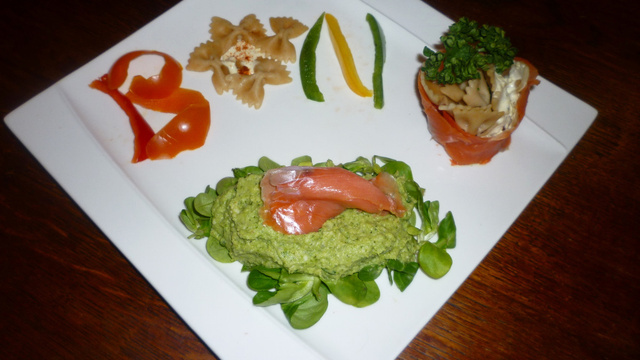 On a aussi fait un petit pot de saumon, dans le coin de l'assiette,et dans lequel on a mis le reste de pâtes, que l'on avait aussi assaisonnées avec la sauce crème fraîche,moutarde, citron et on a décoré d'un petit bouquet de persil