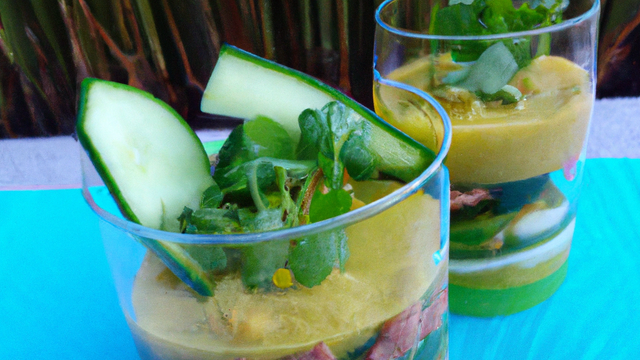 Commencez par la mousse. Mettez donc la gélatine à ramollir. Réservez 1/4 du concombre, épluchez le reste et mixez le avec le fromage blanc et la coriandre. Faites chauffer 2 CS de ce coulis et dissolvez-y la gélatine essorée. Mélangez ensuite avec le reste du coulis et réservez.