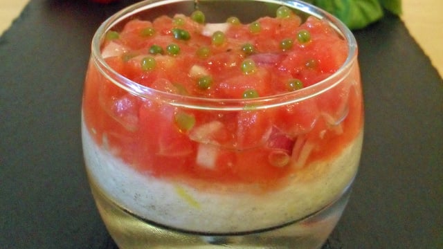 Ramollir la feuille de gélatine dans de l'eau froide. Hacher grossièrement la mozzarella, puis ajouter le zeste de citron, l'huile d'olive, le sel et le poivre. Chauffer 1,5 cl de petit lait filtré dans un filtre à café pour y fondre la gélatine essorée. Mélanger au reste puis hacher finement au mixeur le mélange. Monter le blanc en neige et l'incorporer à la mozzarella. Garnir le premier tiers des verrines, puis réserver au frais pour une heure minimum.