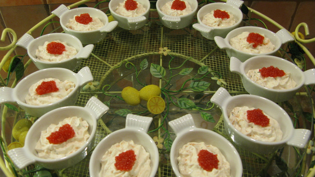 Pour la garniture, vous avez le choix entre des oeufs de lompes rouges ou noirs, des oeufs de saumon ou une crevette avec un petit brin d'aneth.
