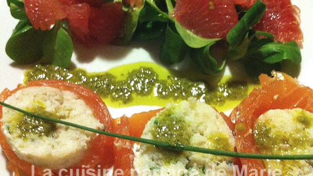 Dresser en accompagnant les roulés avec de la mâche, les suprêmes de pamplemousse et napper du pesto à la mâche.