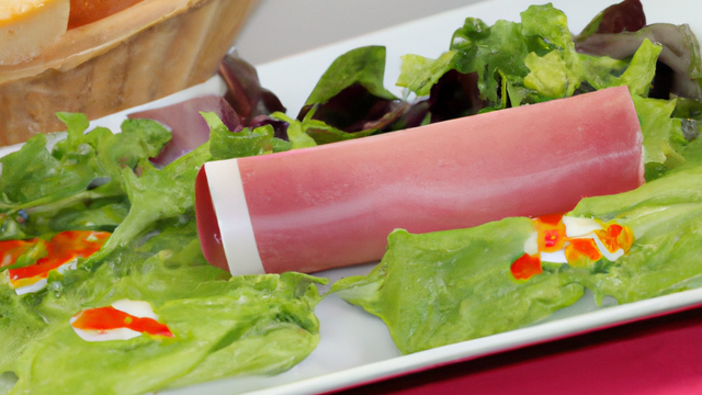 Dans une assiette carrée, positionner au centre un cercle à pâtisserie de 10 cm de diamètre. Au fond du cercle mettre de la chiffonade de salade, par dessus étaler de la mousseline de légumes, retirer le cercle, disposer au tour 4 tranches de jambon de Bayonne et recouvrir de salade d'herbe.