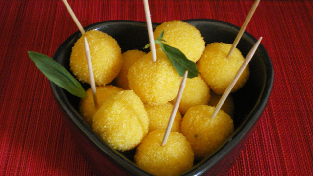 Passer les billes de mozza dans la farine, puis dans l'oeuf battu et enfin dans la polenta. Renouveler l'opération 1 fois. Mettre au frais 15 minutes.