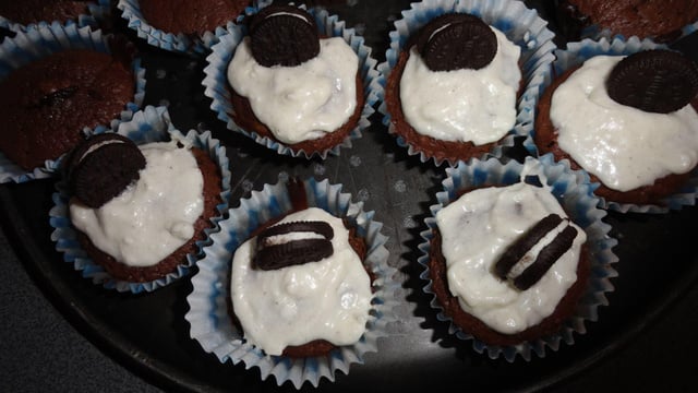 Prenez le lait des oréo, ajouter y 1 à 2 cuillère de lait, mélanger. Une fois les muffins froid, étaler le lait dessus et décorer avec les minis oréo.