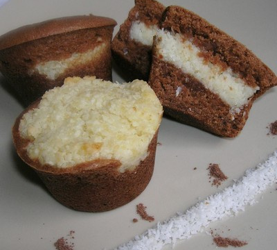 Verser une csp de pâte dans les empreintes à mini muffin, déposer un galet de coco, recouvrir ou non avec un peu de pâte et enfourner pour 20 min