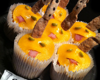 Posez des caissettes en papier dans des moules à muffins. Et à l'aide d'une cuillère à soupe, remplissez à moitié chaque caissette. Décorez chaque muffin d'une demie tomate cerise, d'une lamelle d'emmental et de la moitié d'une olive noir.