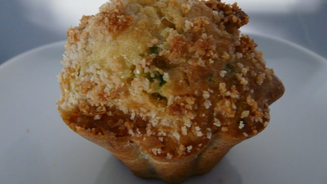 Muffin St Marcellin, courgette, bacon, crumble, parmesan et romarin.