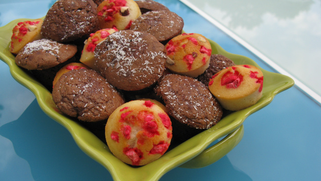 Répartissez l'appareil dans les empreintes. Déposez 1 framboise sur le dessus de chaque muffin. - 6
