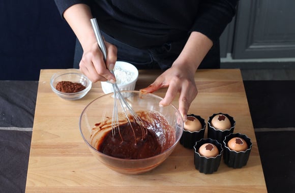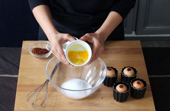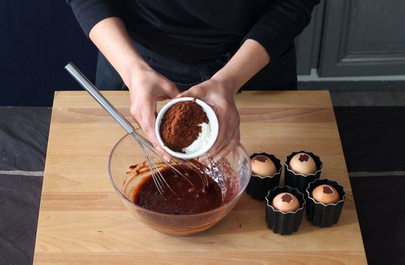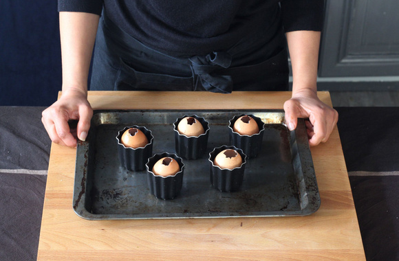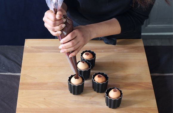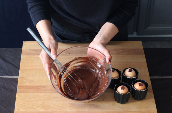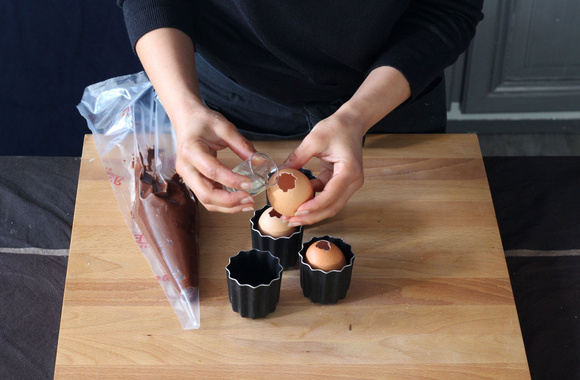 10Remplissez une poche à douille de pâte au chocolat et remplissez les œufs au 3/4. Posez-les dans des petits moules assez haut ou dans des verres allant au four afin que les œufs soient droits pendant la cuisson.