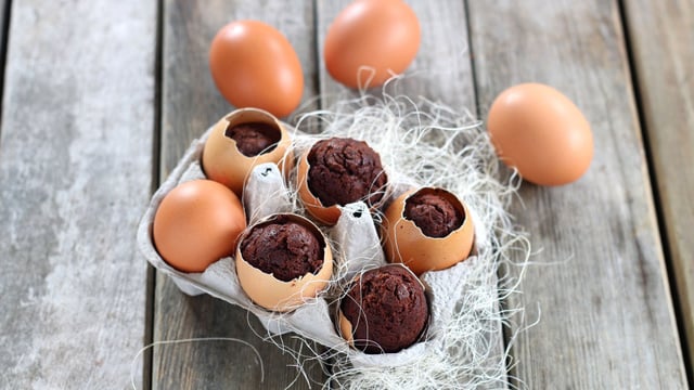 12Retirez la moitié de la coquille d’œuf afin de rendre visible chaque muffin au chocolat en forme d’œuf. Dégustez.