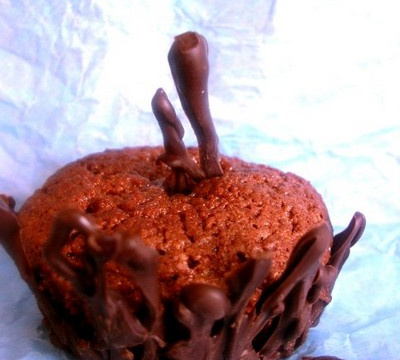 Pour faire la décoration en chocolat, faire fondre du chocolat, recouvrir un petit bol de film alimentaire et faire des "coulures" de chocolat pour former un petit bol. Attendre que le chocolat durcisses, démouler, déposer votre muffin à l'intérieur(sans sa caissette papier).