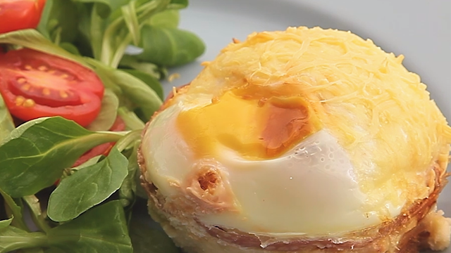 A la sortie du four, ajouter une tranche de rosette sur chaque ramequin, une cuillère de sauce tomate et 1 oeuf par ramequin.