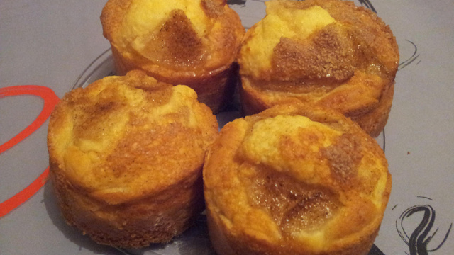 Chemiser des disques de papier sulfurisé et placer les sur une plaque de cuisson. Verser de la pâte jusqu'au 3/4 des disques. Saupoudrer de quelques noisettes de beurre et de sucre en poudre si vous le voulez. Cuire 15-20 mn environ (vérifier la cuisson à l'aide de la pointe d'un couteau).