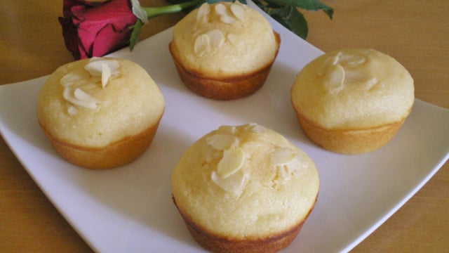 Préchauffer le four à 210°C. Beurrer des moules à muffins et remplir les alvéoles aux 2/3. Parsemer d'amandes effilées.