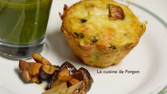 Dans un saladier, mélanger tous les ingrédients. Répartir la pâte dans les moules à muffins. Poser sur chaque muffin, une belle tranche de champignons. Enfourner dans un four préchauffé à 180°C pendant 30 min.