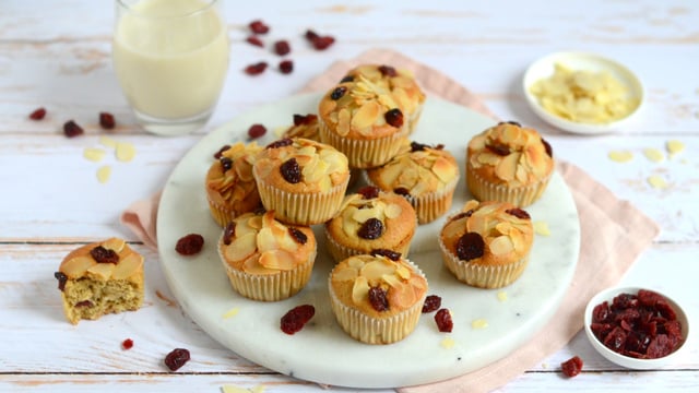 Voici notre recette de muffins à base de farine semi-complète, de cassonade, d'huile de tournesol et de lait d'amandes. On ajoute pour le parfum, des cranberries séchées et des amandes effilées.