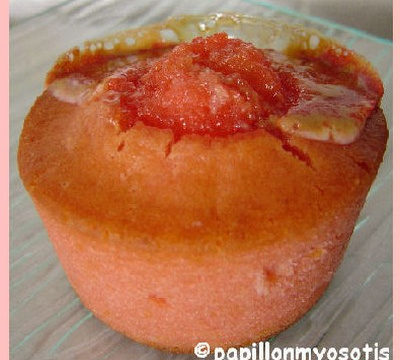 6° Disposez une fraise Tagada légèrement enfoncée sur la pâte de vos muffins (j'ai réalisé 3 muffins avec une fraise Tagada en plus sur le haut du gâteau et les 3 autres sans).