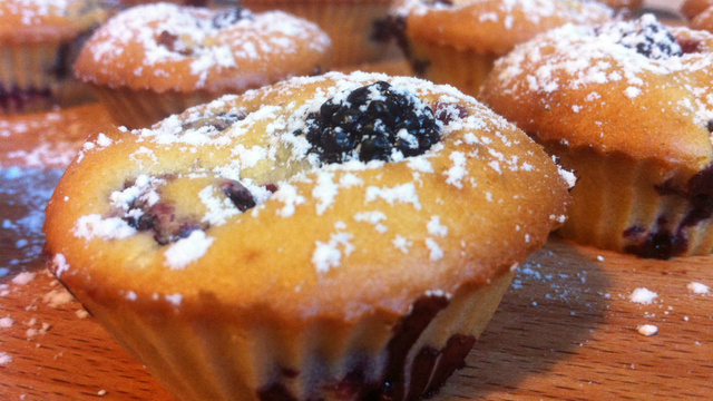 Préchauffer le four à 180°C. Mélangez la farine, la levure, et le sucre puis faire un puits. Mélangez le beurre mou, le lait et l'œuf dans un autre saladier puis mettre les liquides dans le saladier des solides, Bien mélanger. Ajoutez les mûres, incorporez (gardez-en quelques unes pour mettre sur le dessus).