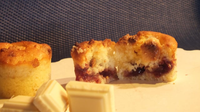 Mélangez la farine et la levure, ajoutez-les à la pâte en alternance avec le lait. Préchauffez le four à 180°c (th6). Remplissez les moules de pâte jusqu'à mi hauteur, ajoutez une cuillère de confiture de cerise noire, recouvrez de pâte, terminez en concassant les carrés de chocolat blanc, parsemez les gâteaux.